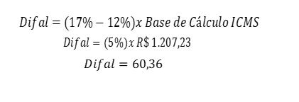 A diferença entre a alíquota interna de MS, que é 17% para esse produto, menos os 12% da alíquota interestadual, resulta no percentual de 5%, que deve ser aplicado sobre a base de cálculo de R$ 1.207,23. Portanto, o ICMS DIFAL é de R$ 60,36.